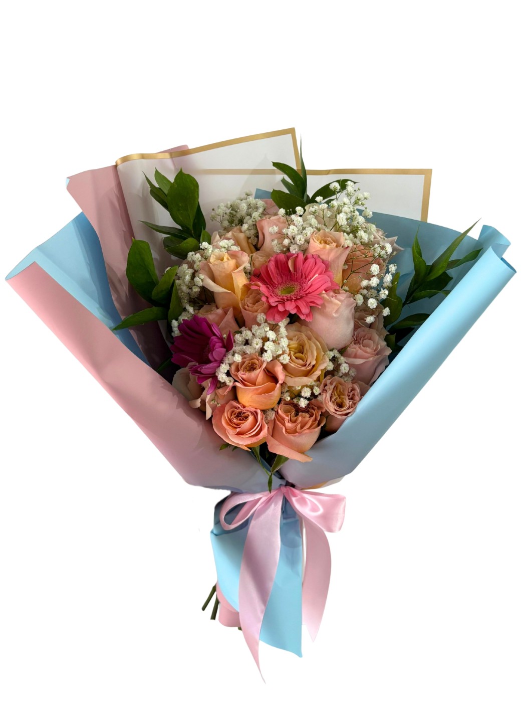 Ramo de 12 rosas de manera vertical, 2 gerberas y 4 follajes