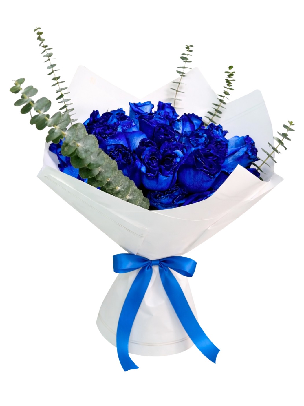 Ramo de mano elaborado con 25 rosas azules y 3 variedades de follajes opcionales