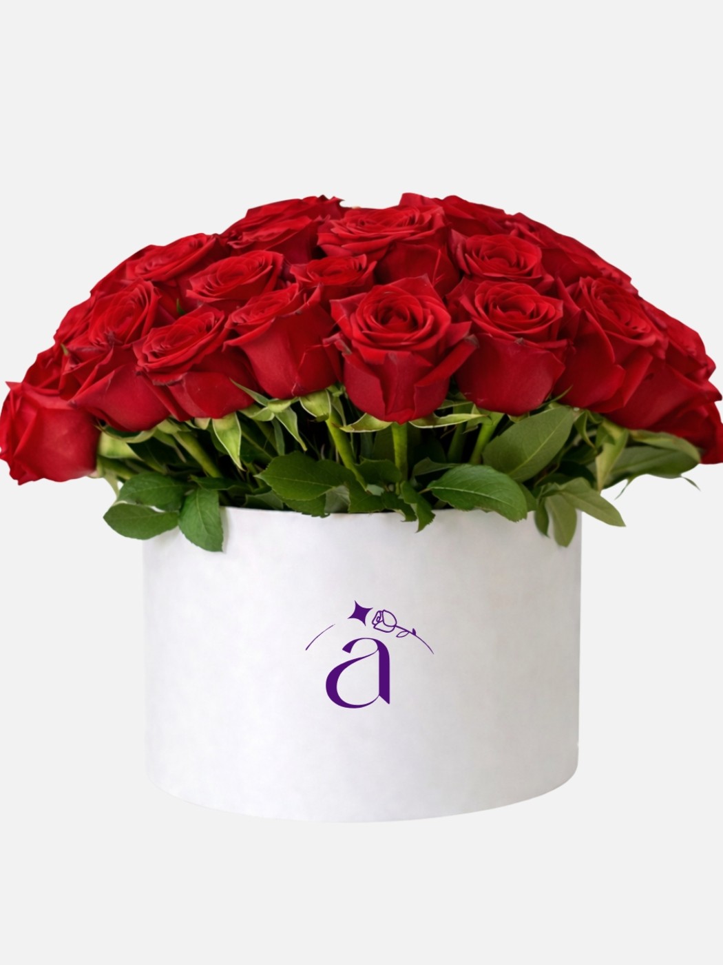 Arreglo elaborado en caja de 15.5 cm 50 rosas y 12 tallos de follajes