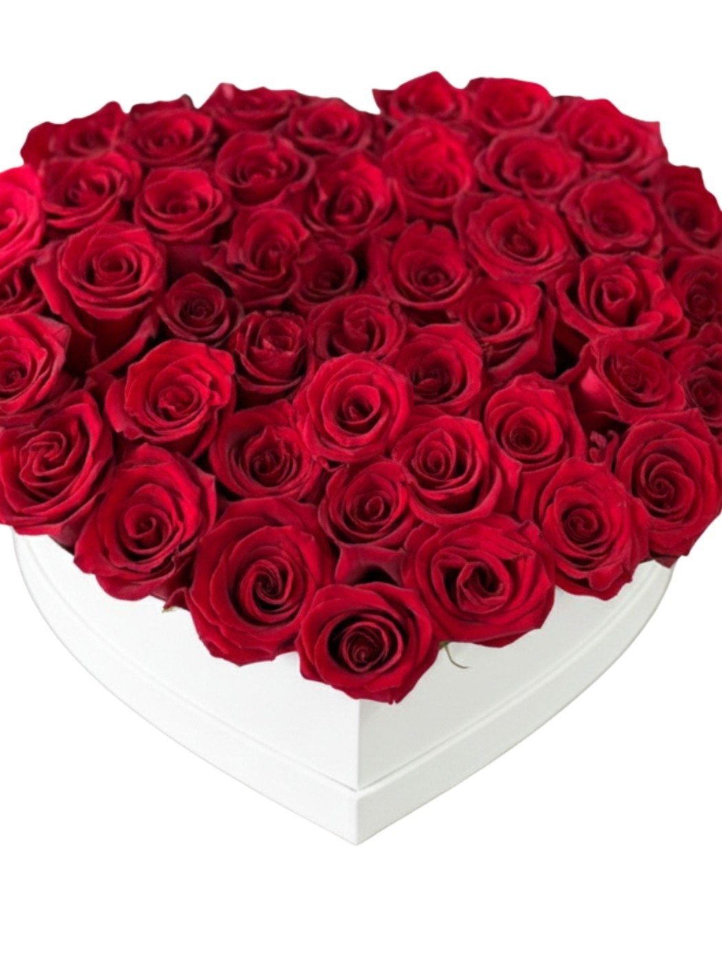 Arreglo de 50 rosas en caja de forma de corazón de 30 cm de diámetro