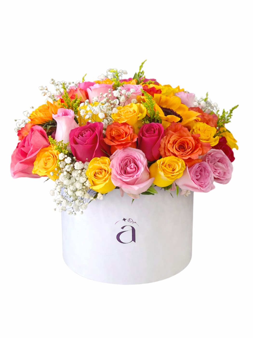 Elaborado con caja de 26 cm de diámetro, 35 rosas 5 girasoles y follajes opcionales