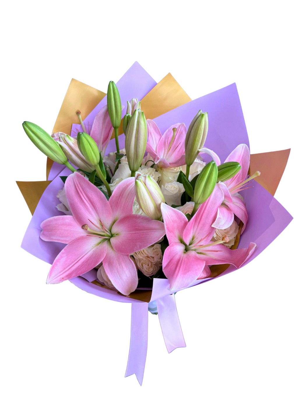 Ramo de 20 rosas, 4 tallos de lirios y follajes opcionales
