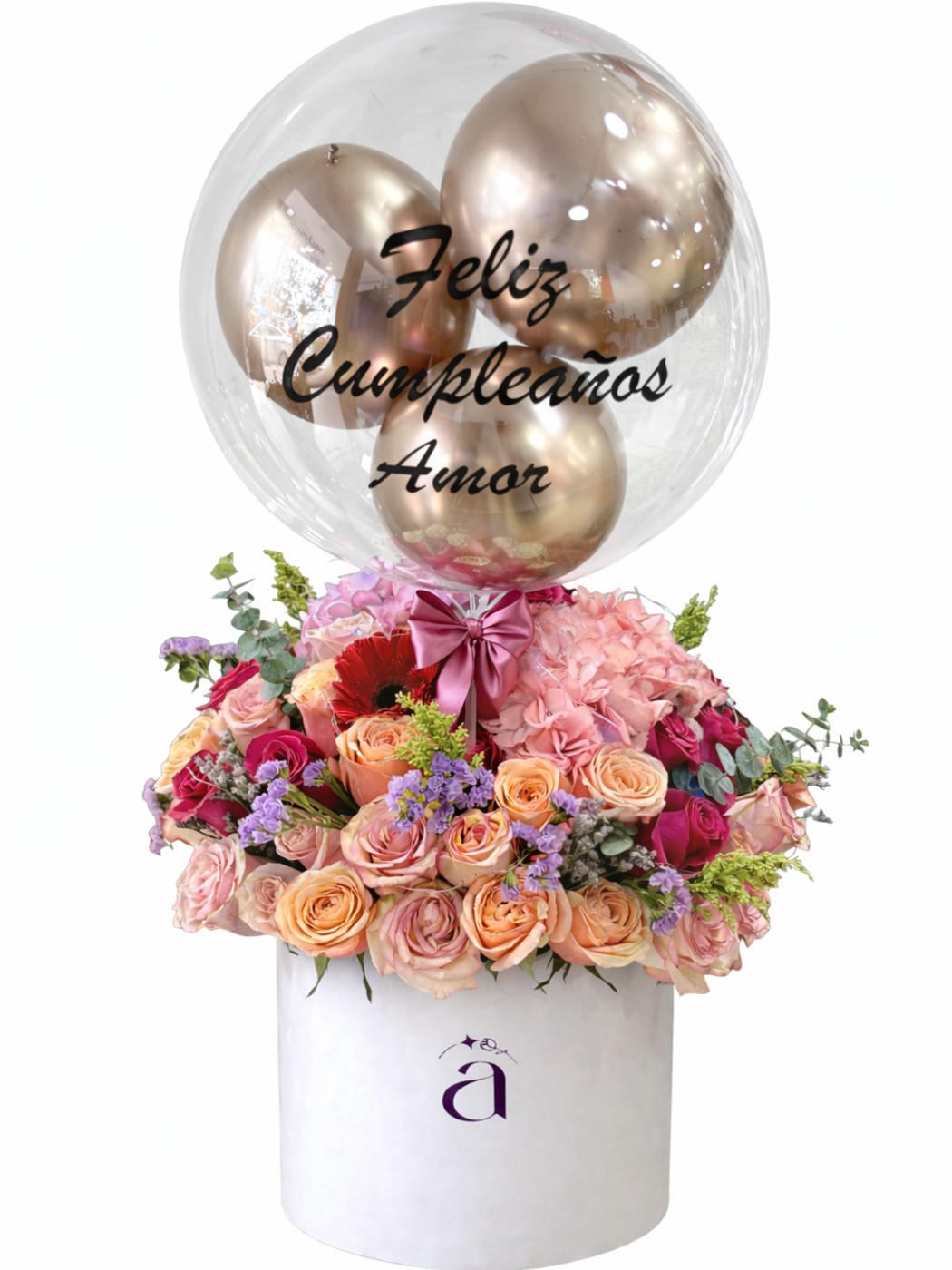 Elaborado con caja de 15,5 cm de diámetro, 35 rosas, 1 hortensia ,12 tallos de follajes y globo burbuja