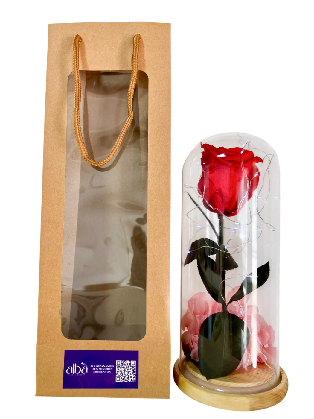 Rosa preservada en cupula larga de cristal, incluye bag.