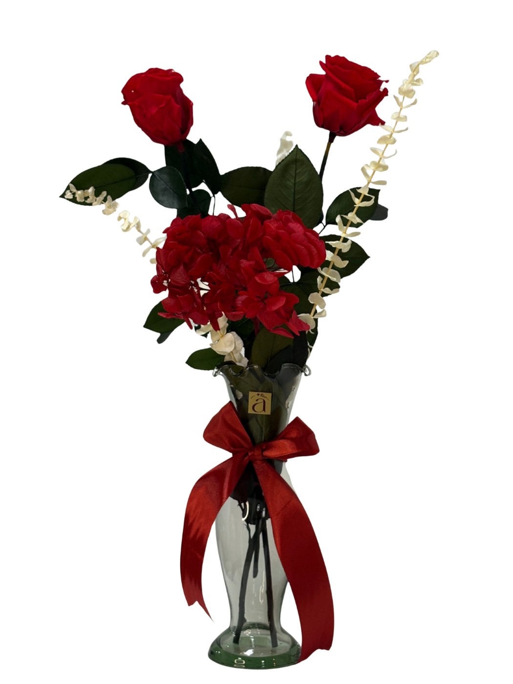 Florero de cristal con brote de hortensia, dos tallos de rosa y follaje preservados