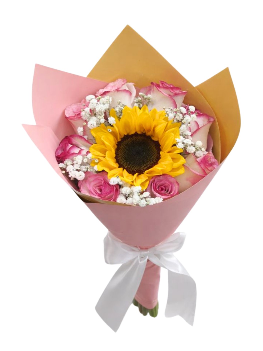 Ramo de 8 rosas, 1 girasol y follajes opcionales